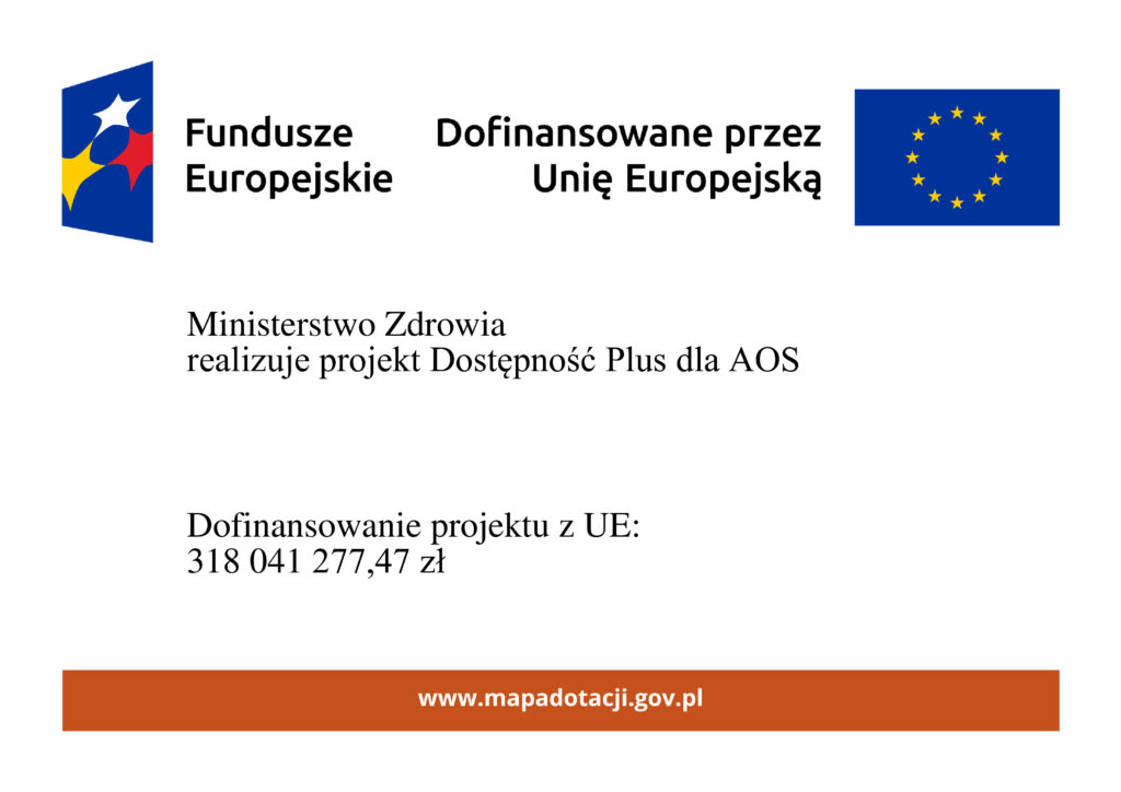 Umowa o powierzenie grantu w ramach projektu granatowego nr FERS.03.07-IP.07-0001/23 pod nazwą „Dostępność Plus dla AOS” realizowanego w ramach programu Fundusze Europejskie dla Rozwoju Społecznego 2021-2027 współfinansowanego ze środków Europejskiego Funduszu Społecznego Plus.