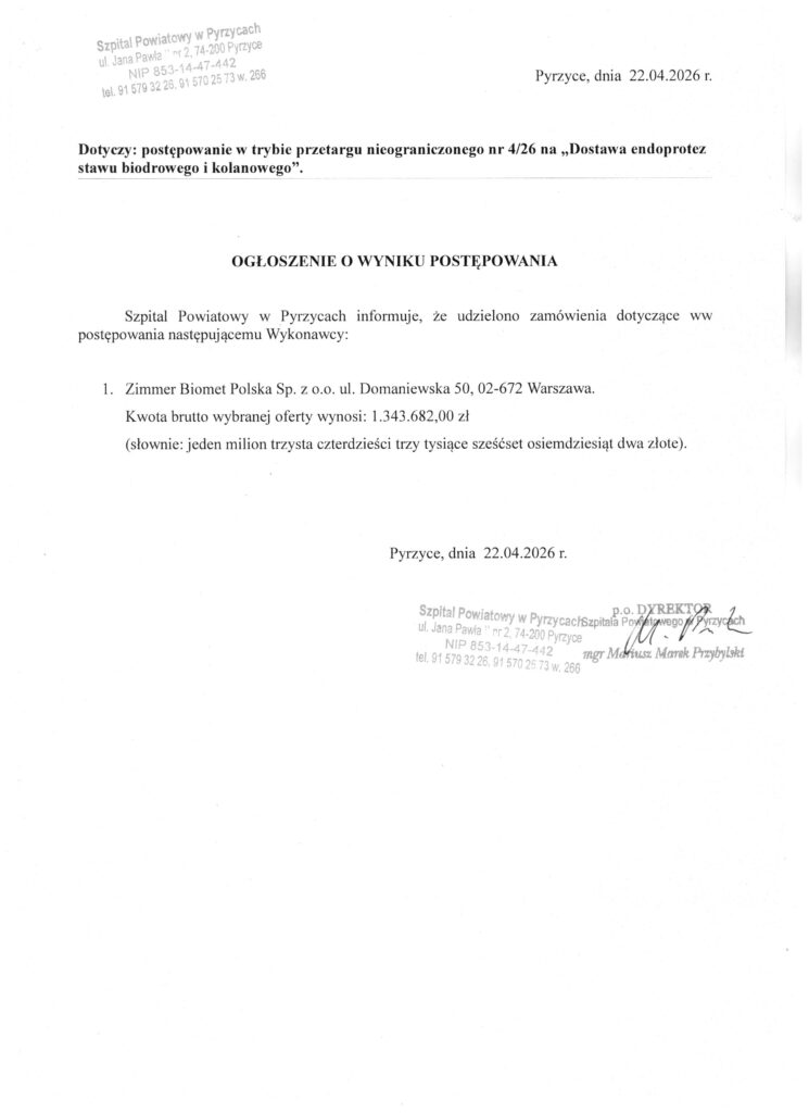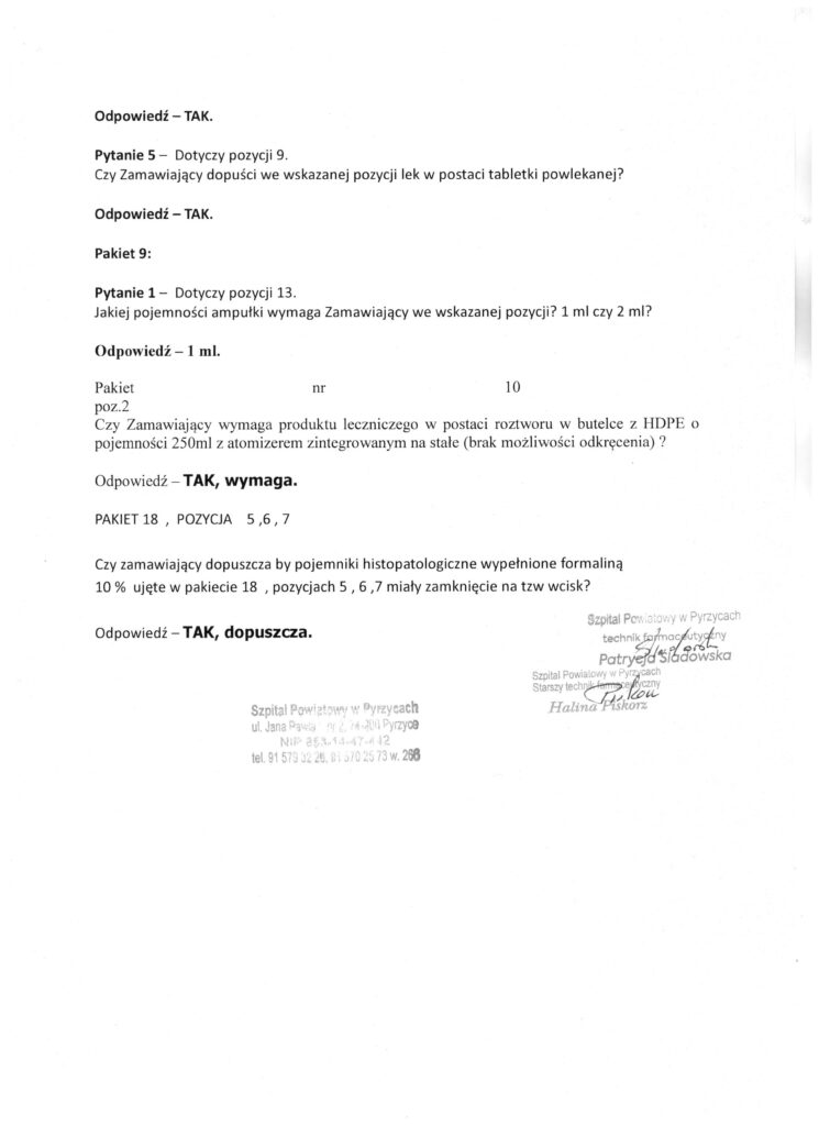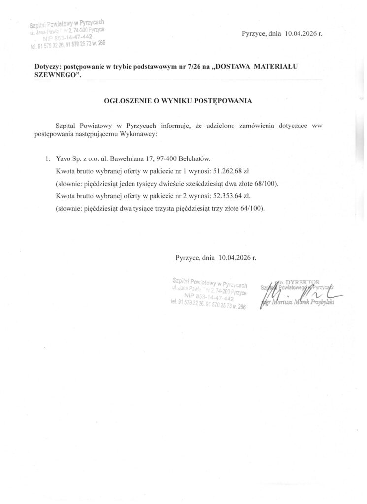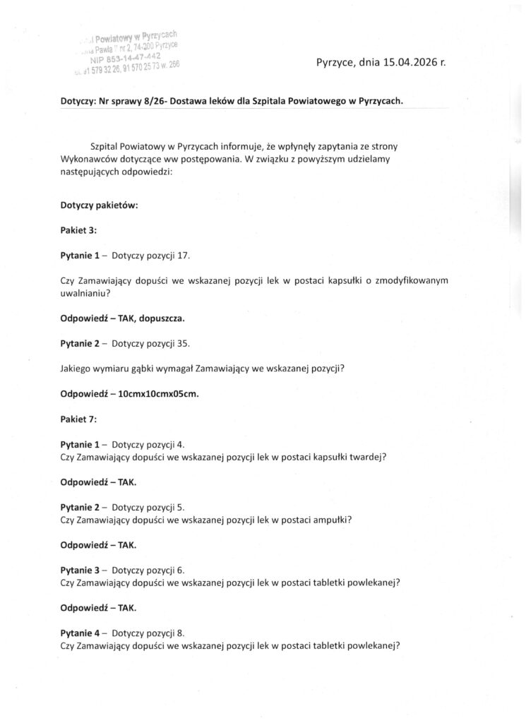 Dotyczy: postępowanie nr 8/26 na: ,,Dostawa leków do Apteki Szpitala Powiatowego w Pyrzycach”