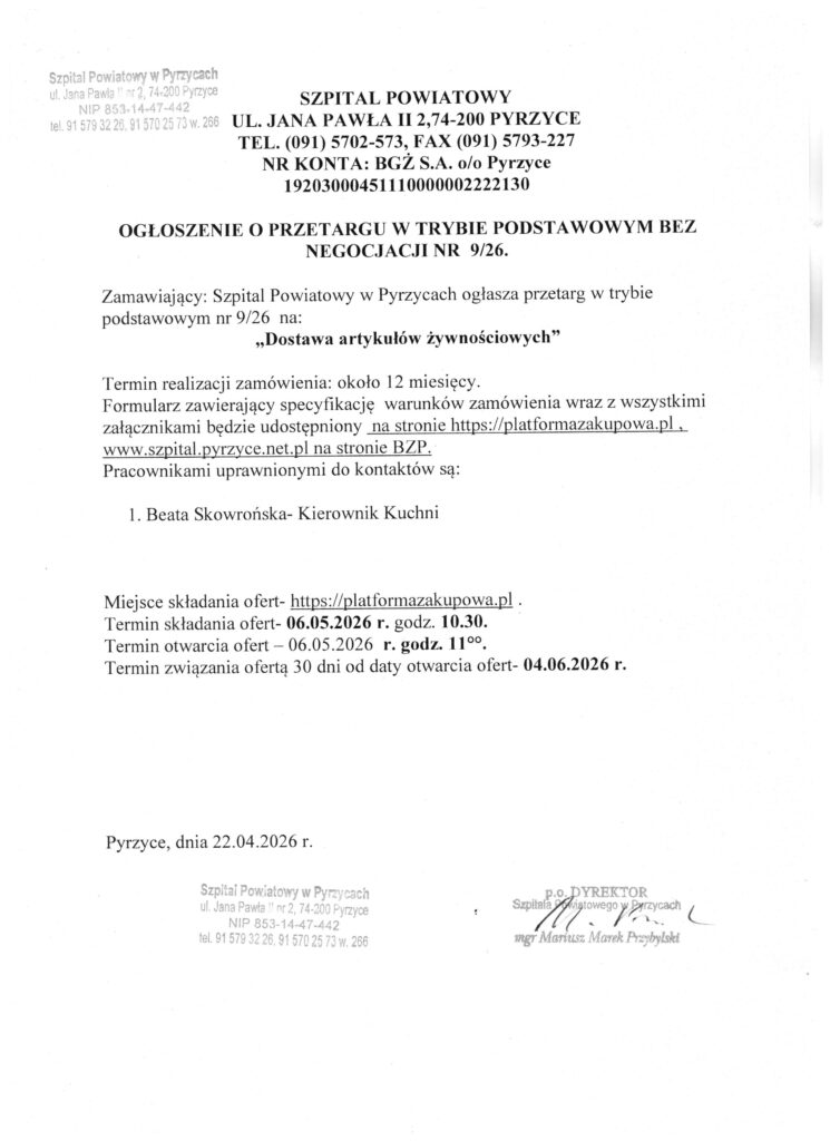 Szpital Powiatowy w Pyrzycach ogłasza przetarg w trybie podstawowym nr 9/26 na: ,,Dostawa artykułów żywnościowych”.