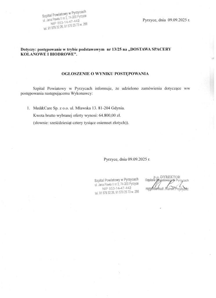Dotyczy: postępowanie w trybie podstawowym nr 13/25 na ,,Dostawa spacery kolanowe i biodrowe”.